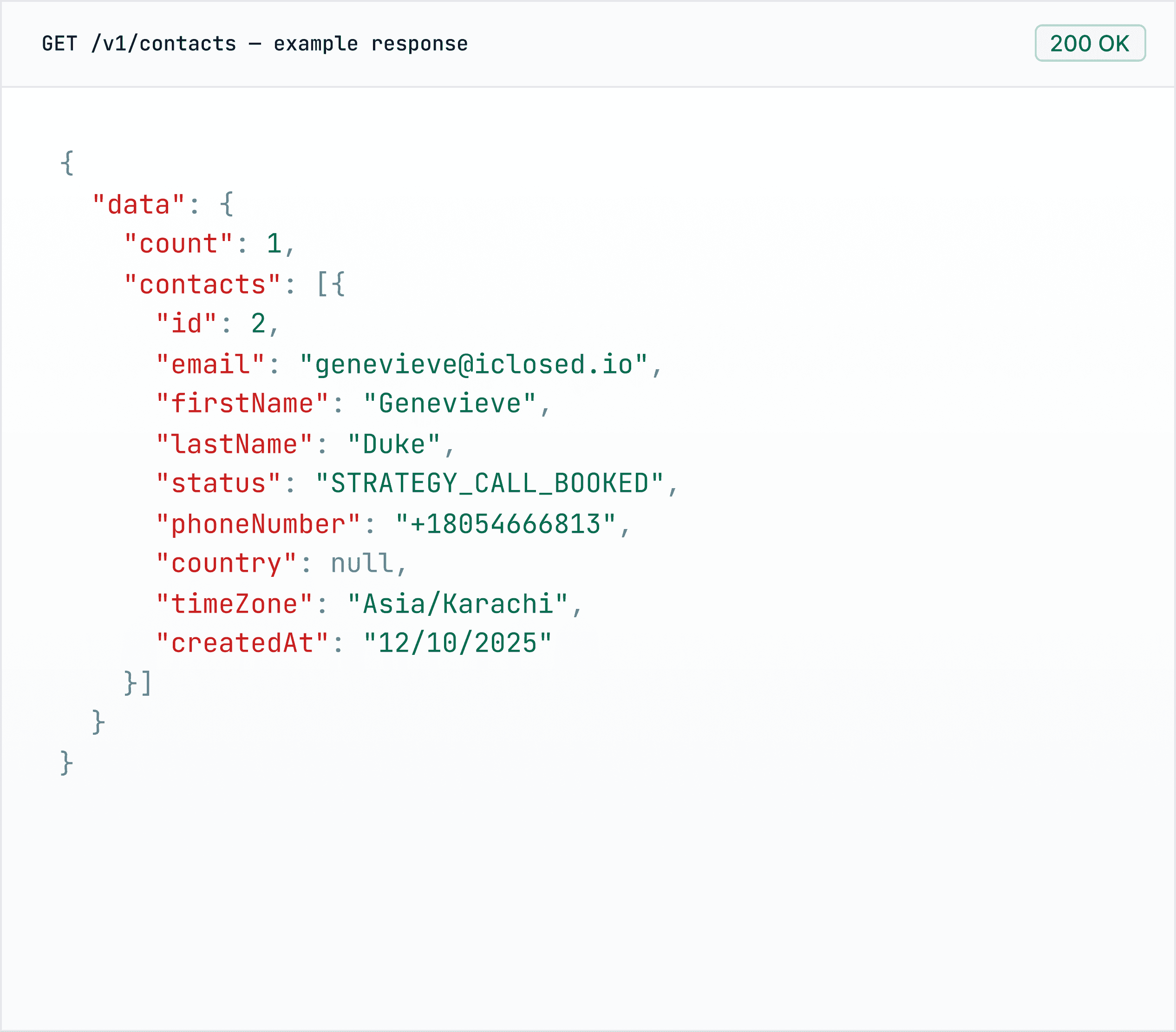 he complete API reference lives at developer.iclosed.io. You'll find: Endpoint reference with request/response examples Authentication guide Webhook setup Data models and field definitions Rate limiting details Changelog The OpenAPI spec is also publicly available if you prefer to generate clients or use tools like Postman.