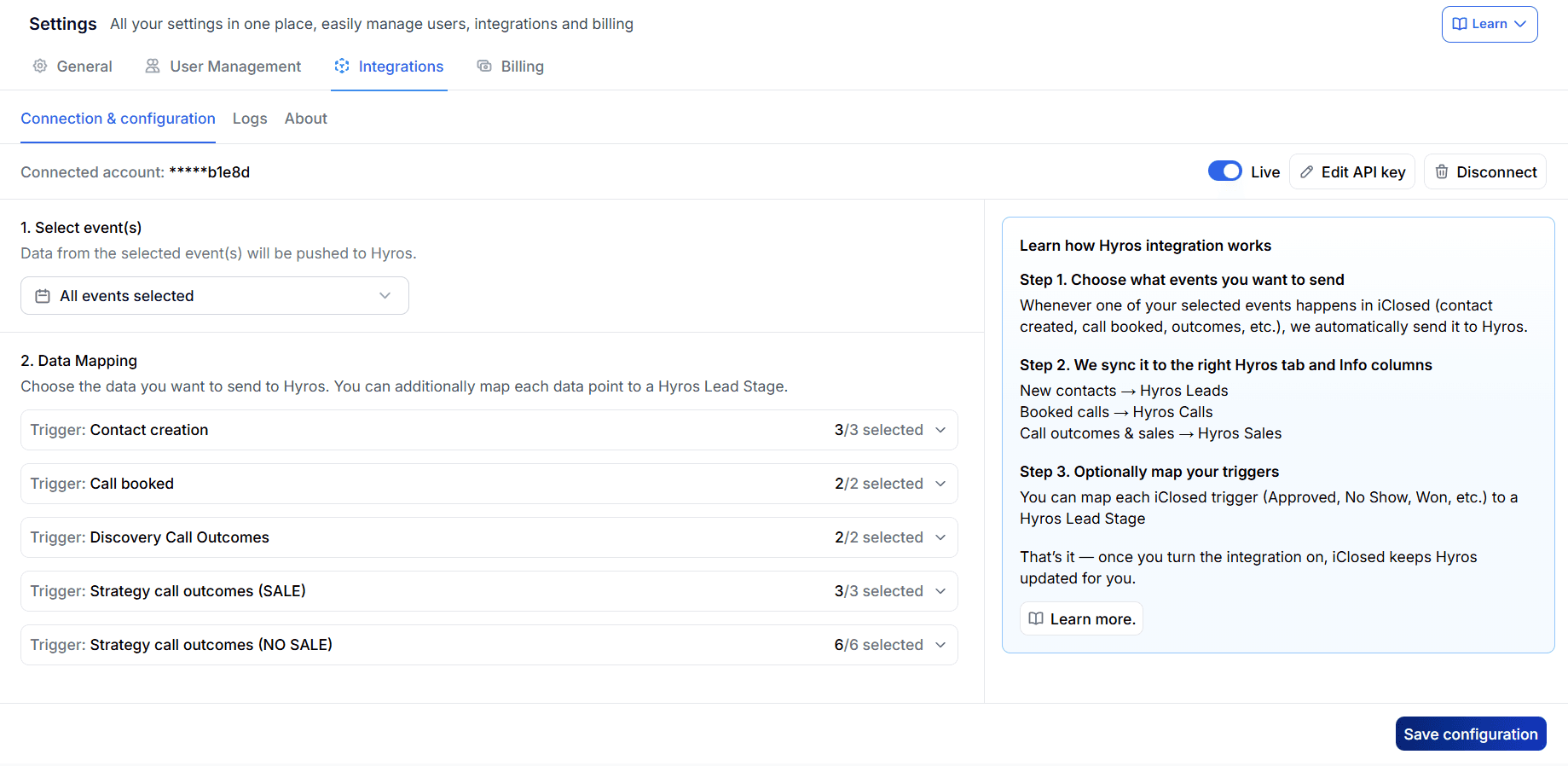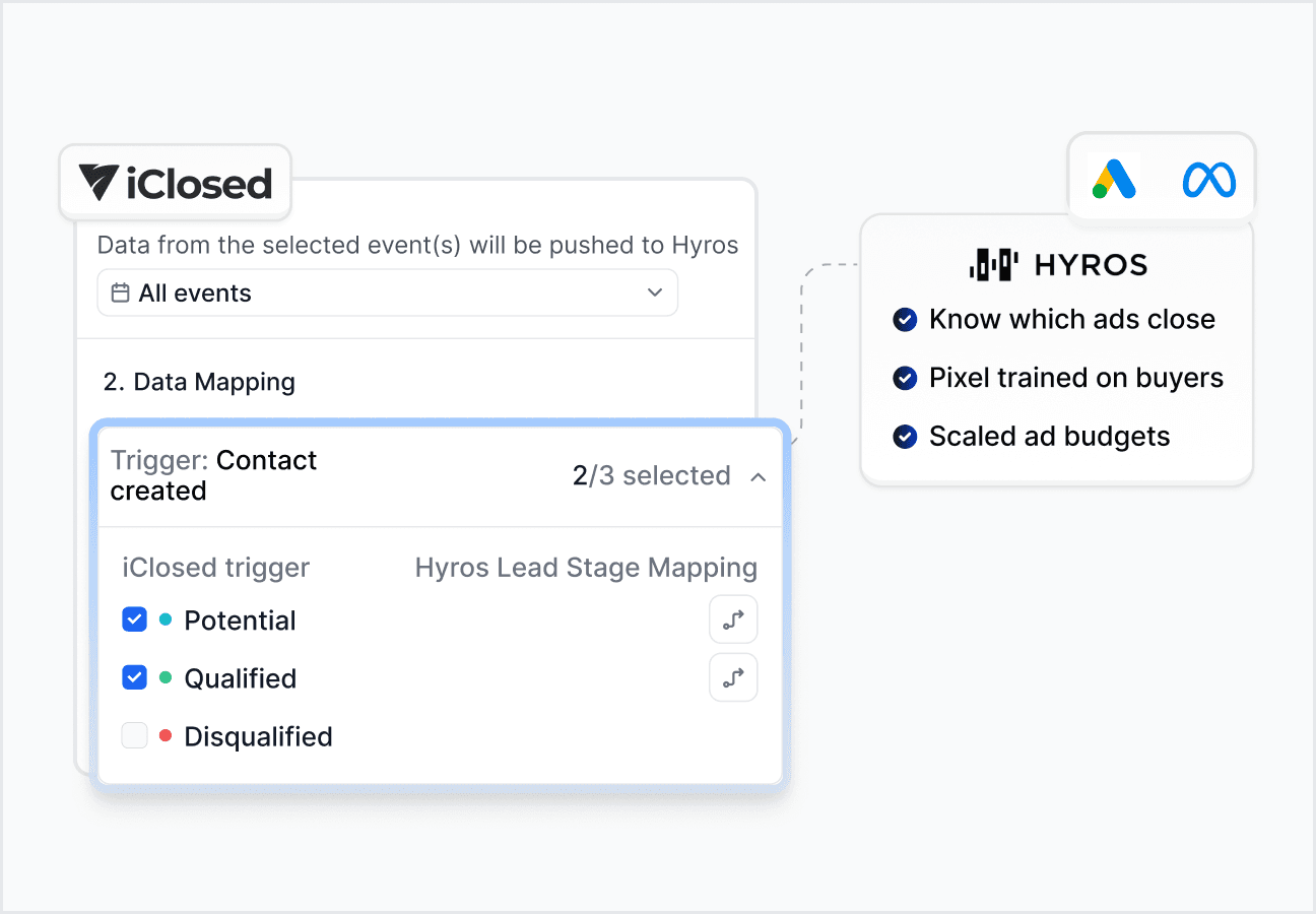 iClosed, the best scheduling software on the market and Hyros, the leading ad tracking software teamed up to help you track your sales data and attribution across your funnel easily with a one-click integration.