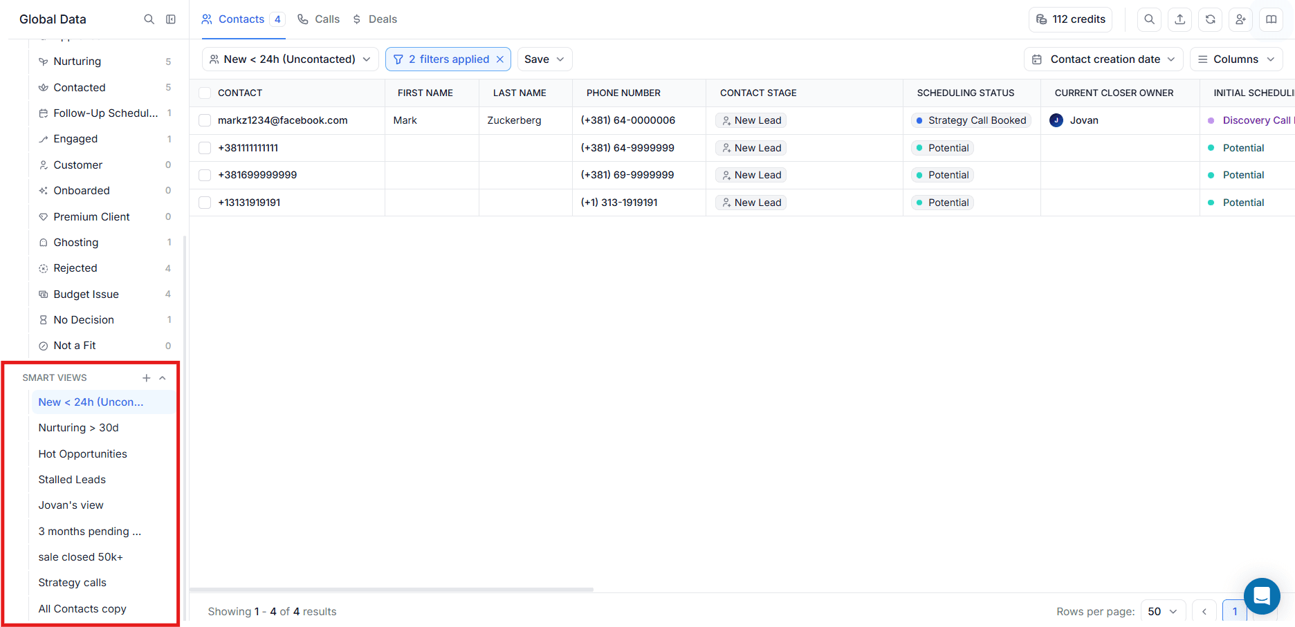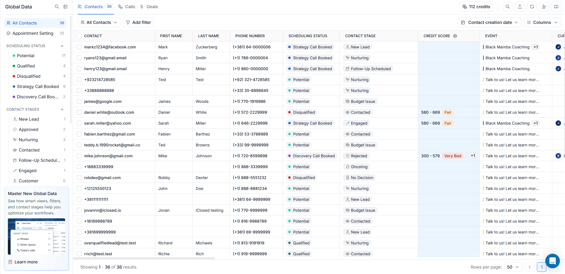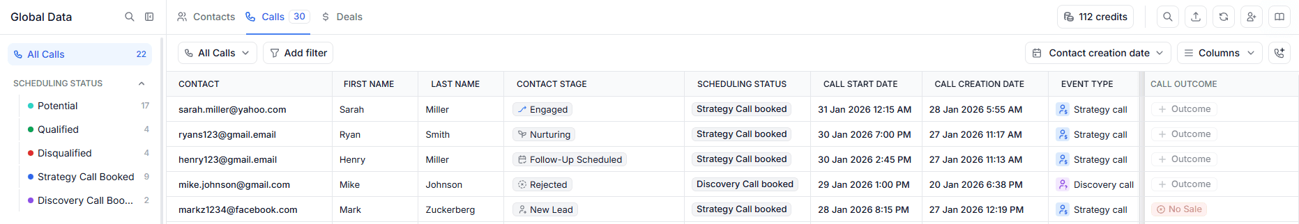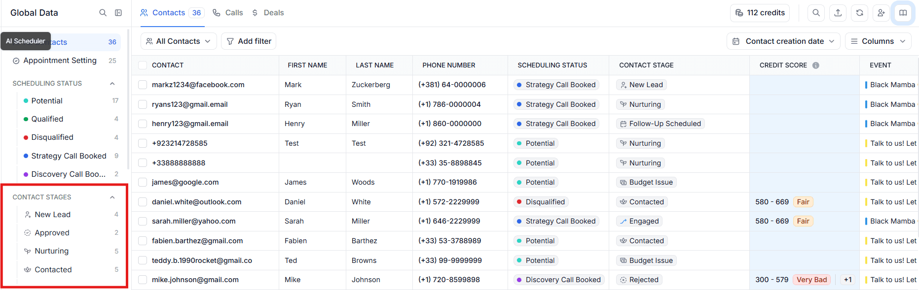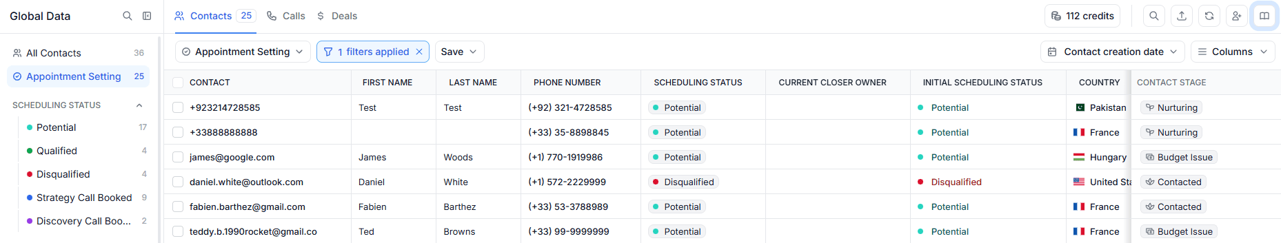 This section is a smart, pre-filtered version of the Contacts table, showing only leads with scheduling statuses such as Potential, Qualified, or Disqualified, from where you can update the Contact Stage based on the outcome of your conversation: