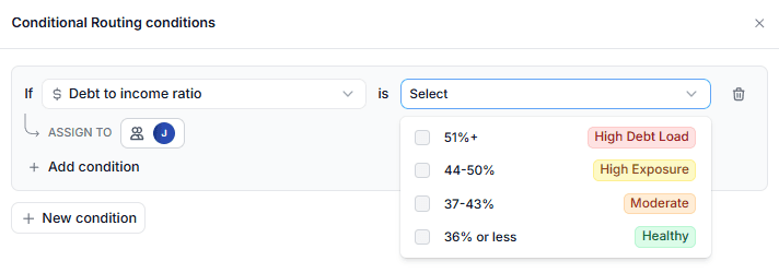 It’s expressed as a percentage and is commonly used in credit and risk evaluation and here're the predefined ranges available for the Disqualification and/or Conditional Routing criteria: