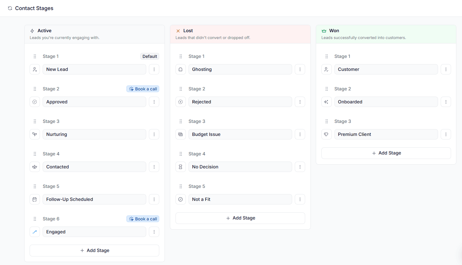 Create and manage stages grouped by Active, Won, and Lost
