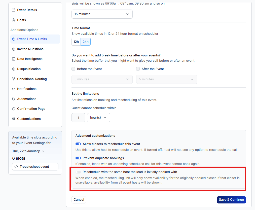 A new Events Time & Limits option gives you more control over how rescheduling works → Reschedule with the same Host. When this option is enabled: